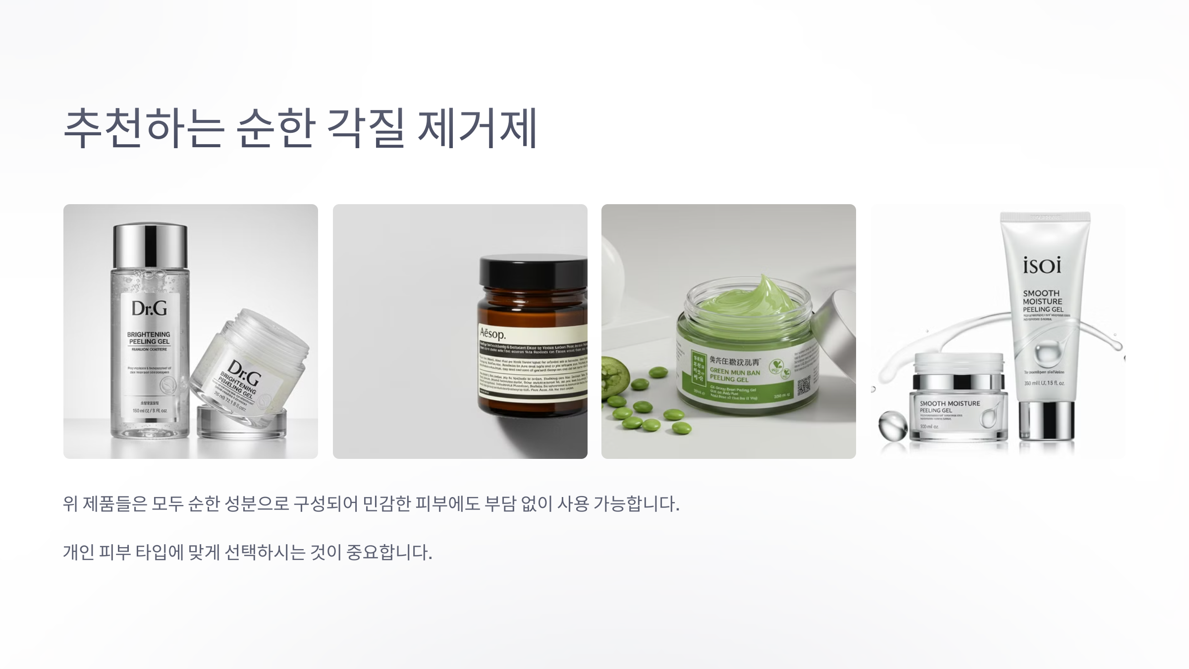 각질 제거제는 피부 타입에 맞는 제품을 선택하는 것이 중요해요! 순하면서도 효과적인 각질 제거 제품을 추천해 드릴게요. 😊