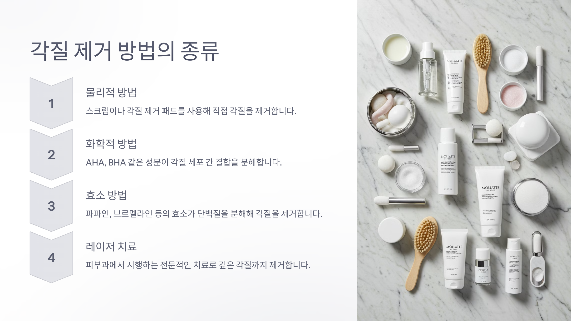 각질을 제거하는 방법에는 크게 두 가지가 있어요. **물리적 각질 제거**와 **화학적 각질 제거**인데요. 각각의 차이를 살펴볼까요?