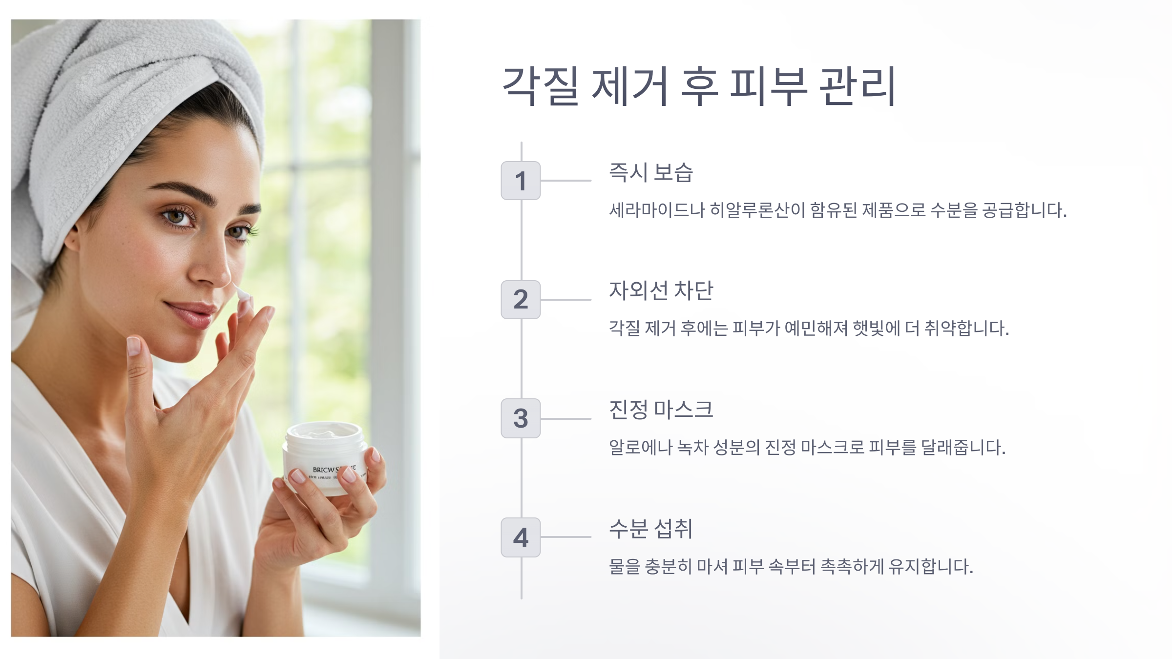각질을 제거한 후에는 피부가 민감한 상태가 되기 때문에 사후 관리가 정말 중요해요! 적절한 보습과 진정 케어를 하면 피부를 건강하게 유지할 수 있어요. 각질 제거 후 꼭 지켜야 할 관리법을 알아볼까요? 😊