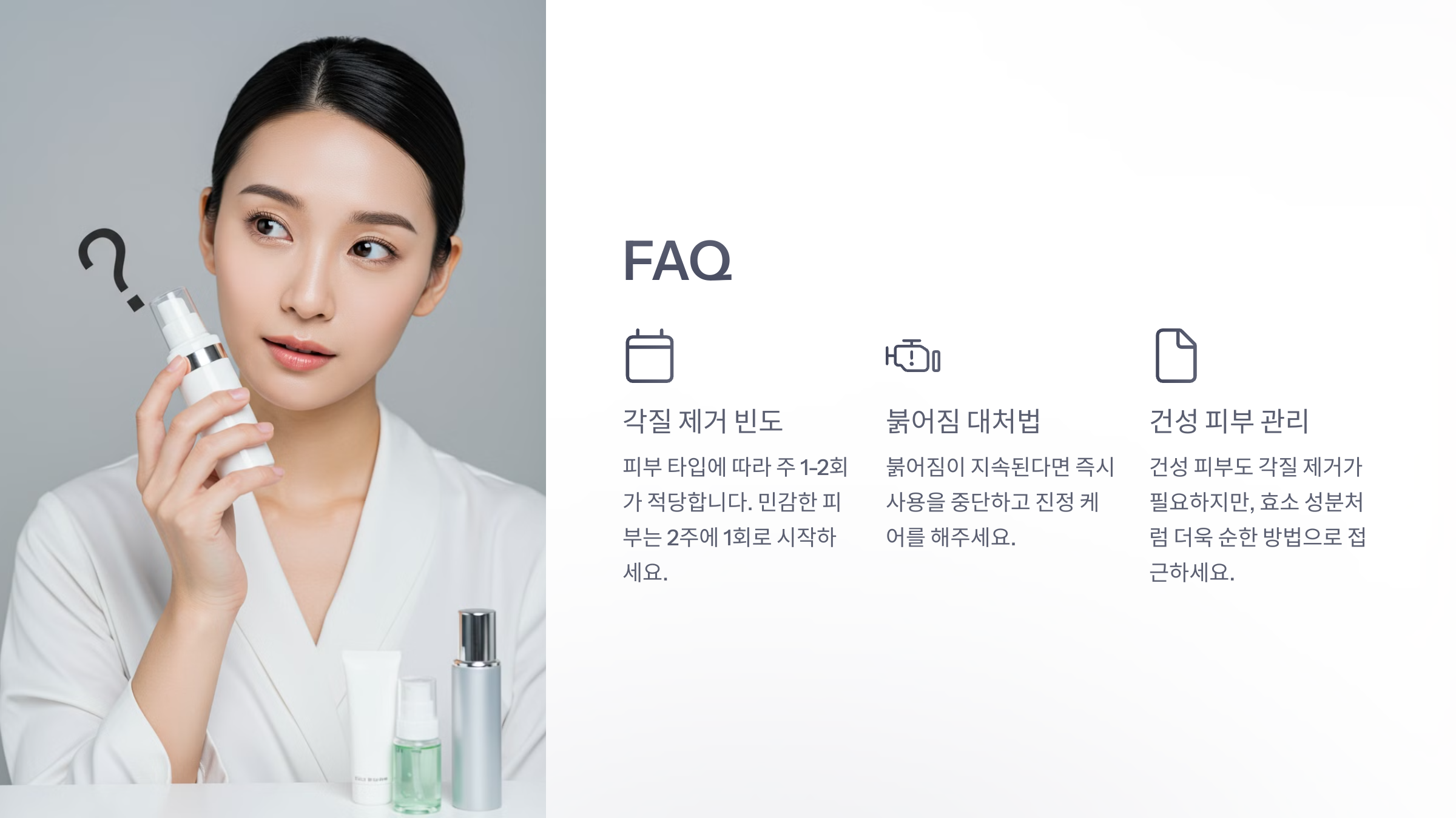 마지막으로, 각질 제거에 대한 궁금증을 풀어볼까요? FAQ 섹션에서 자주 묻는 질문에 답해드릴게요! ❓