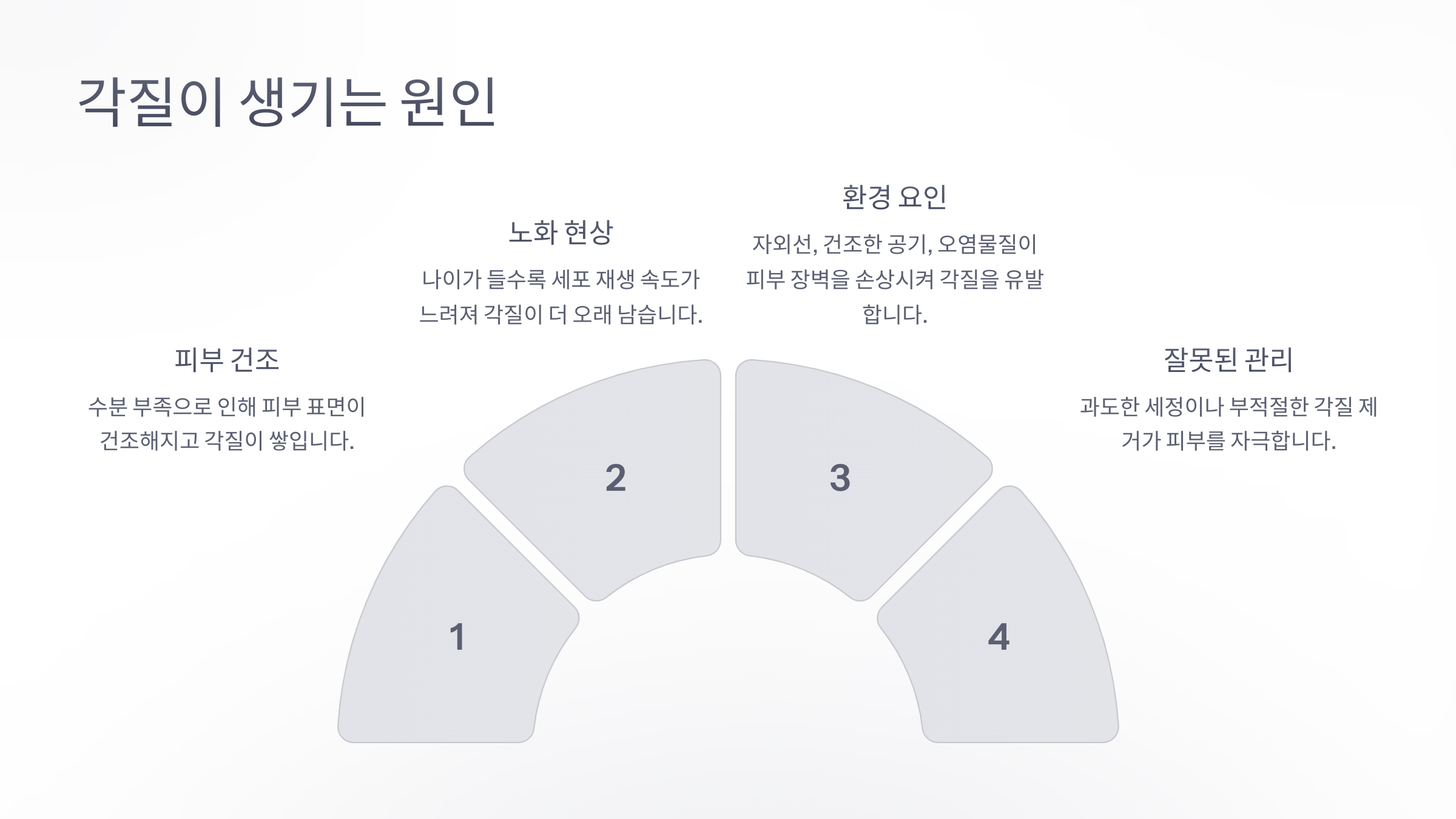 3️⃣ **피부 재생 주기 변화** – 보통 피부는 28일을 주기로 새롭게 바뀌지만, 나이가 들면서 이 주기가 길어져 각질이 쌓일 가능성이 높아져요.