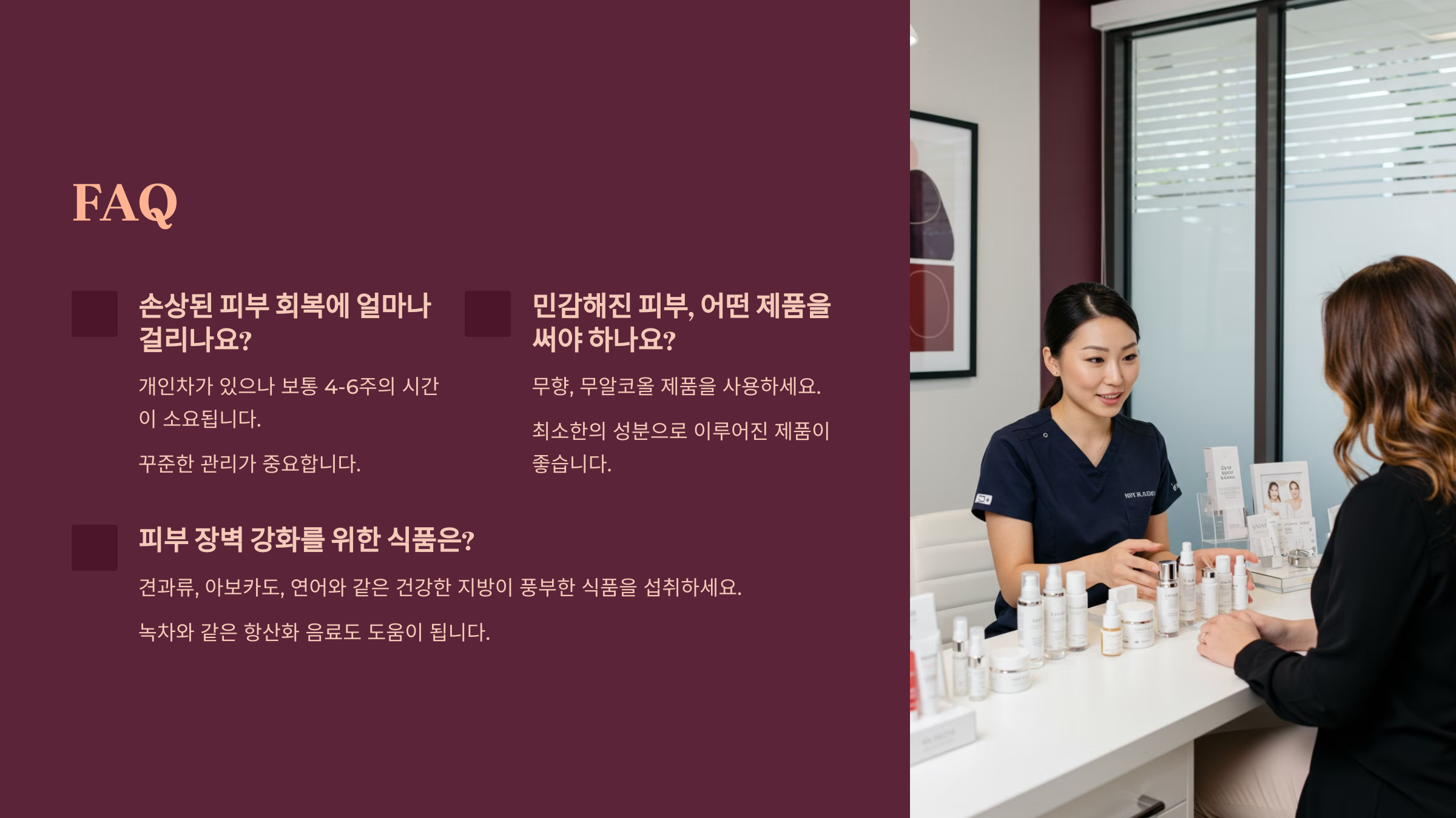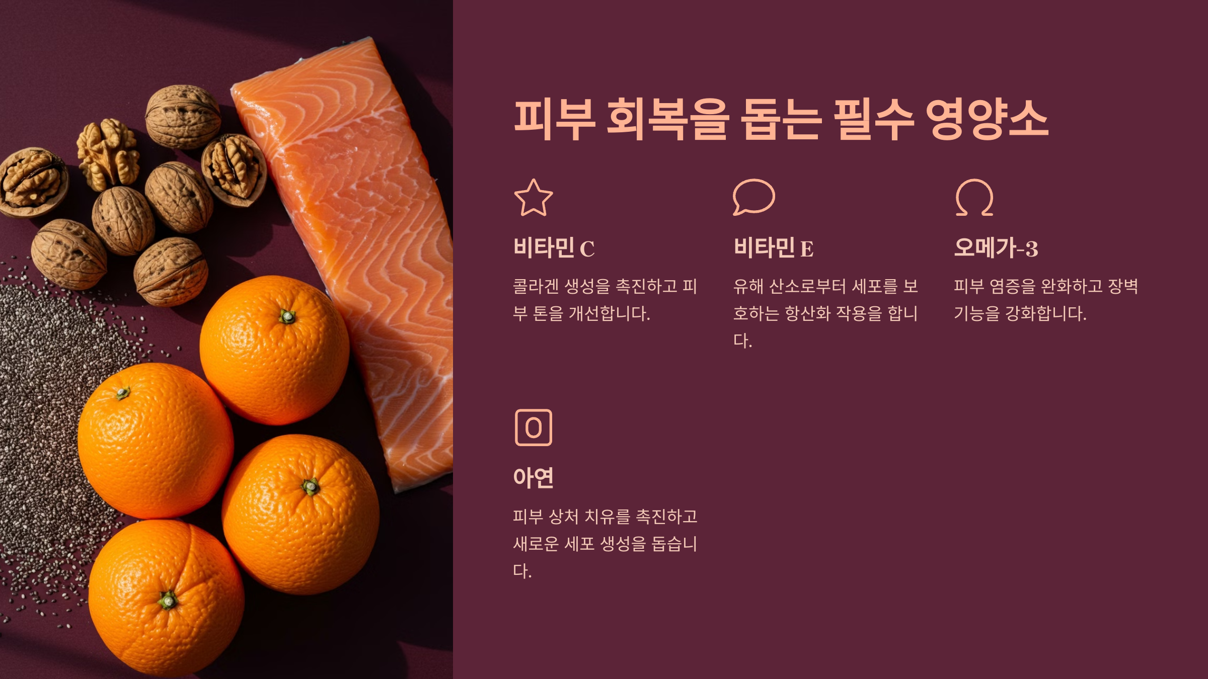 다음 섹션에서는 피부 회복을 돕는 필수 영양소에 대해 알아볼게요! 🥑
