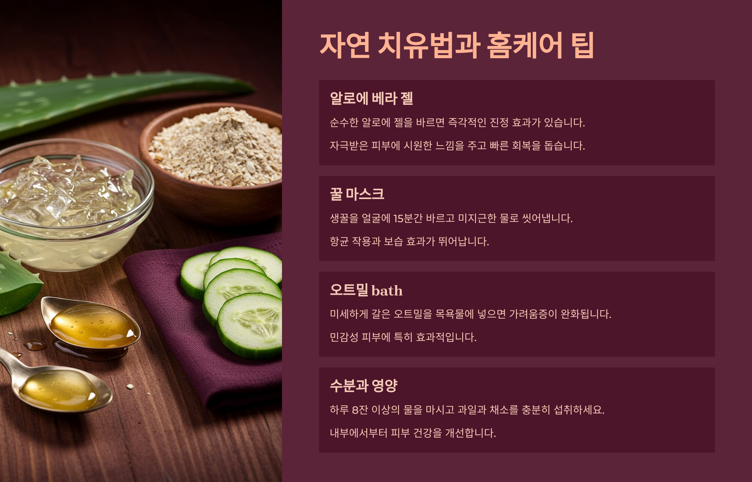 자연에서 얻을 수 있는 성분을 활용하면 피부 손상을 부드럽게 회복할 수 있어요. 집에서도 쉽게 실천할 수 있는 홈케어 방법을 소개할게요! 🏡