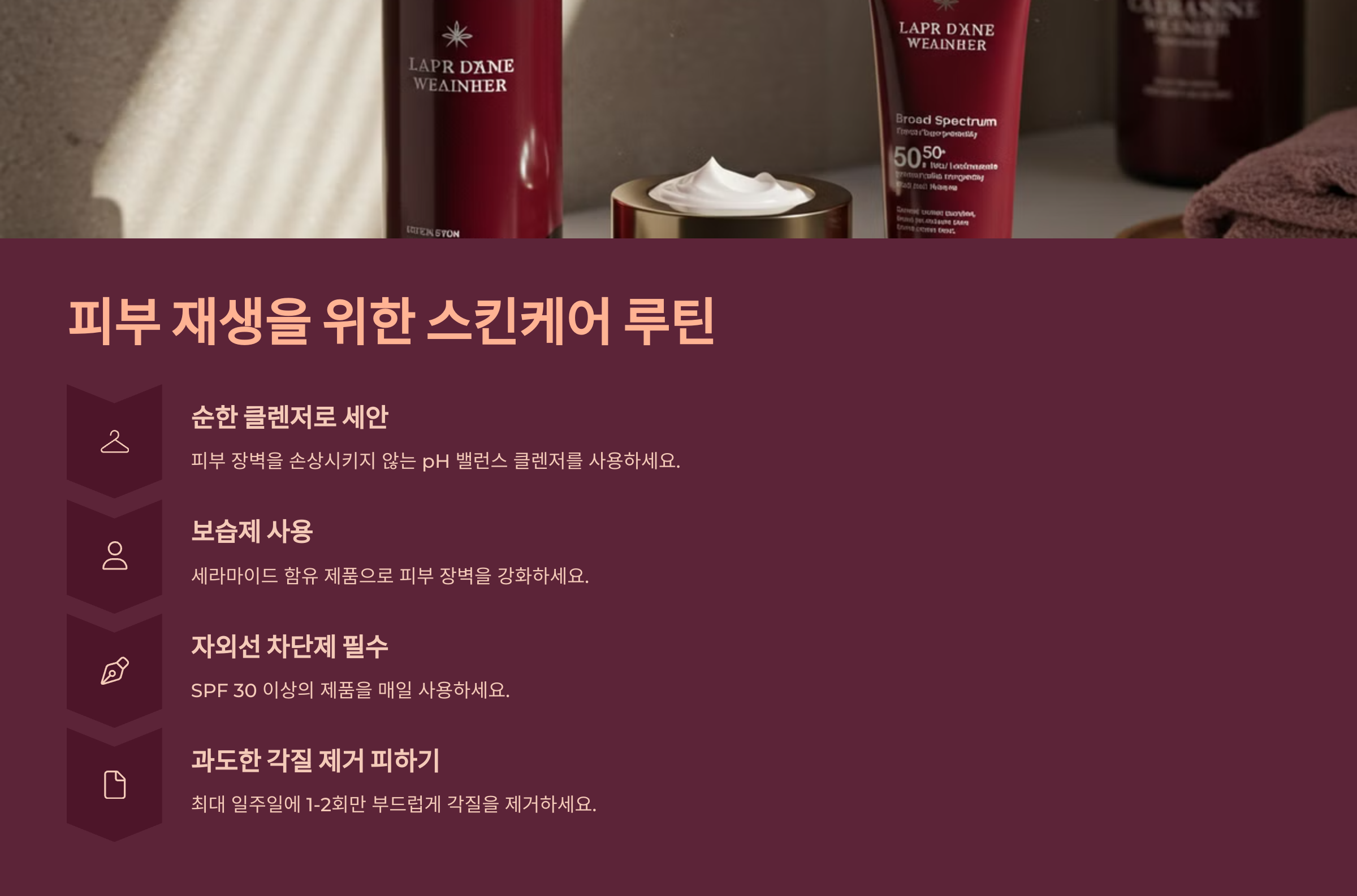 피부 건강은 결국 생활 습관과 식습관에서 시작돼요. 다음 섹션에서는 피부 회복을 위한 스킨케어 루틴을 소개할게요! 💆♀️