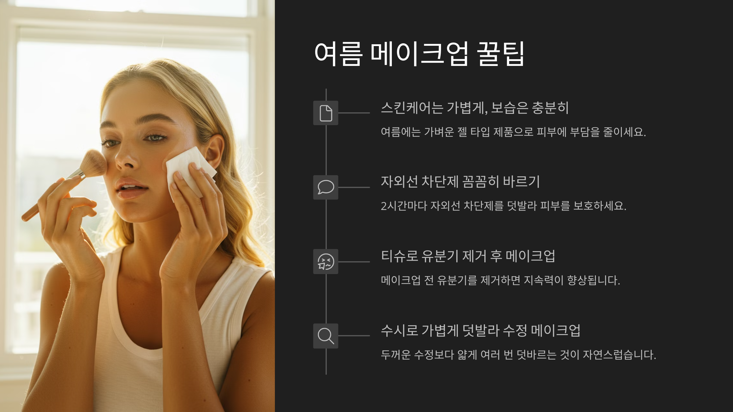 여름철 메이크업, 특히 베이스 메이크업은 "얼굴이 무너지지 않게" 하는 것이 관건이에요. 덥고 습한 날씨에 땀과 피지로 인해 화장이 쉽게 무너질 수 있기 때문에, 제품 선택이 무엇보다 중요하죠.