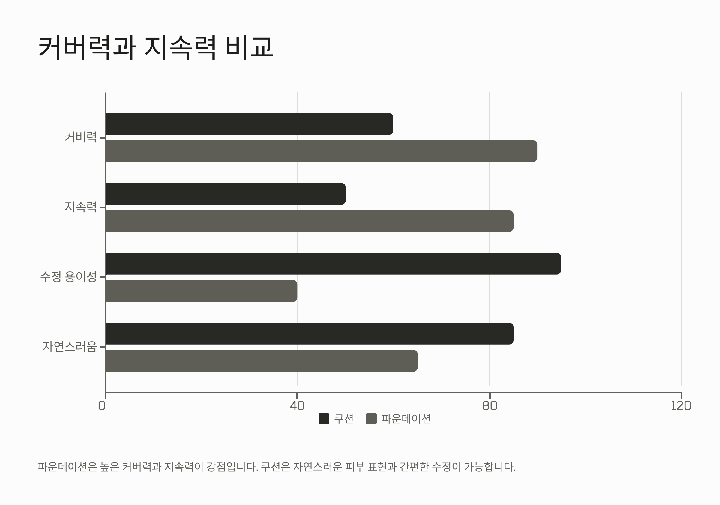 지속력 면에서는 파운데이션이 우위에 있어요. 파운데이션은 건조 후 픽싱되면 마스크에 덜 묻어나고, 장시간 유지되는 편이에요. 특히 여름철이나 땀이 많은 계절에는 파우더로 마무리한 파운데이션이 훨씬 오래가요.