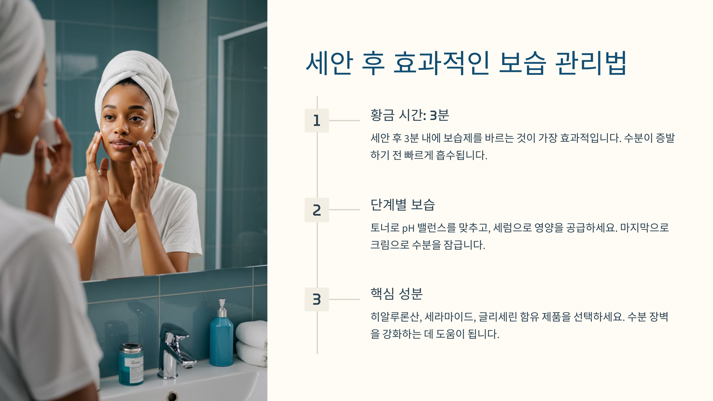 피부에 남아 있는 물기를 가볍게 눌러 제거한 후, 바로 스킨케어를 시작하는 것이 좋아요. 공기 중에 피부가 오래 노출될수록 수분이 더 많이 날아가기 때문에 세안 후 3분 이내에 보습제를 바르는 것이 가장 효과적이에요.