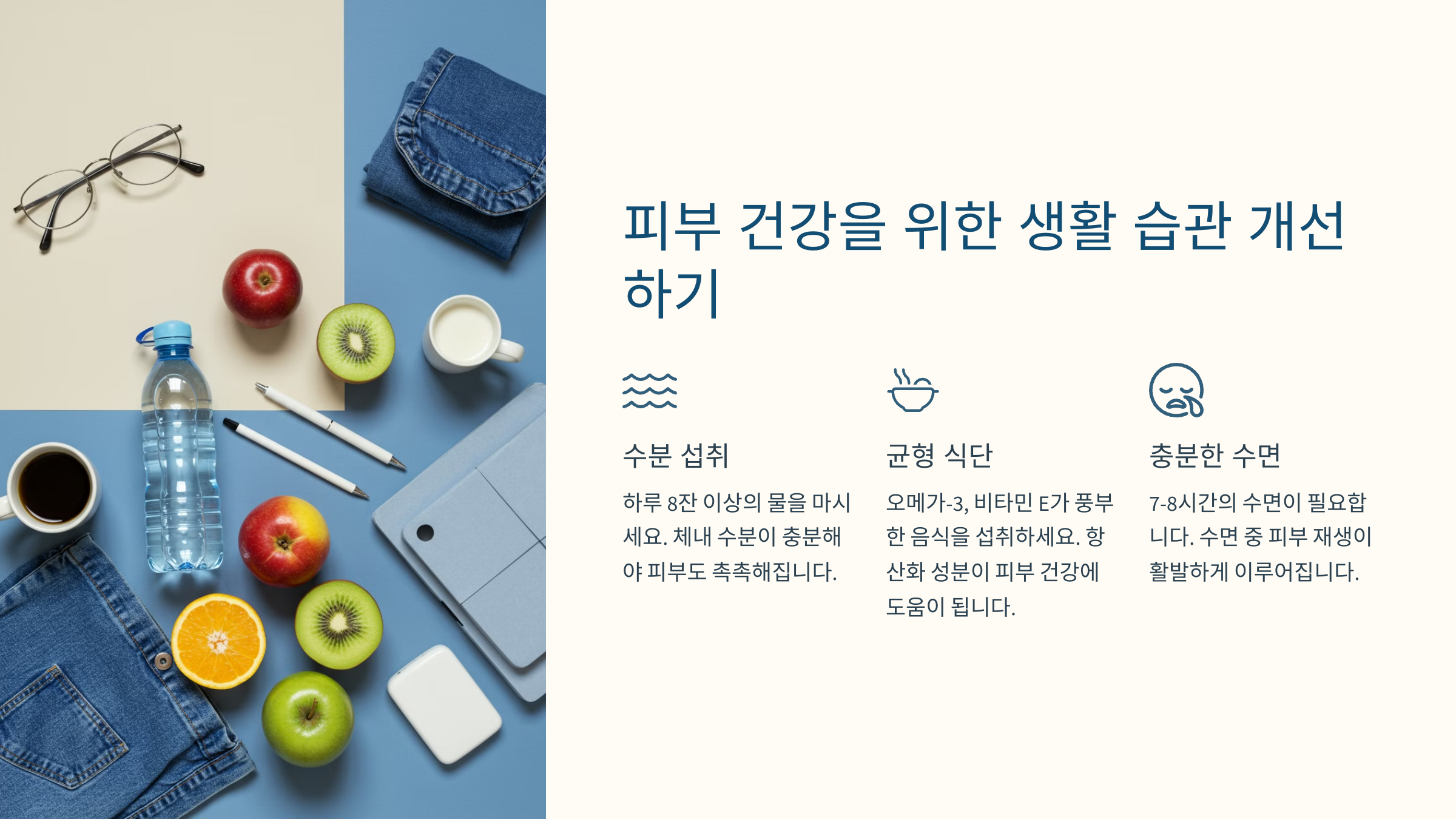 피부 건강은 단순히 바르는 제품만으로 관리할 수 있는 것이 아니에요. 충분한 수분 섭취, 올바른 식습관, 숙면을 유지하면 피부 당김 없이 촉촉한 피부를 유지할 수 있어요! 😊