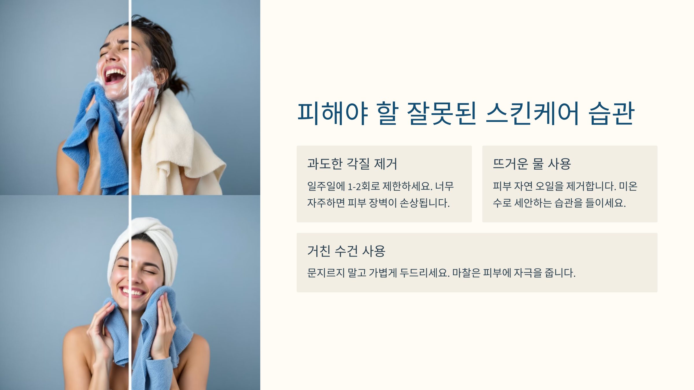 - ❌ 세안을 너무 자주 하는 것: 하루 2회 이상 세안하면 피부 보호막이 손상될 수 있어요.