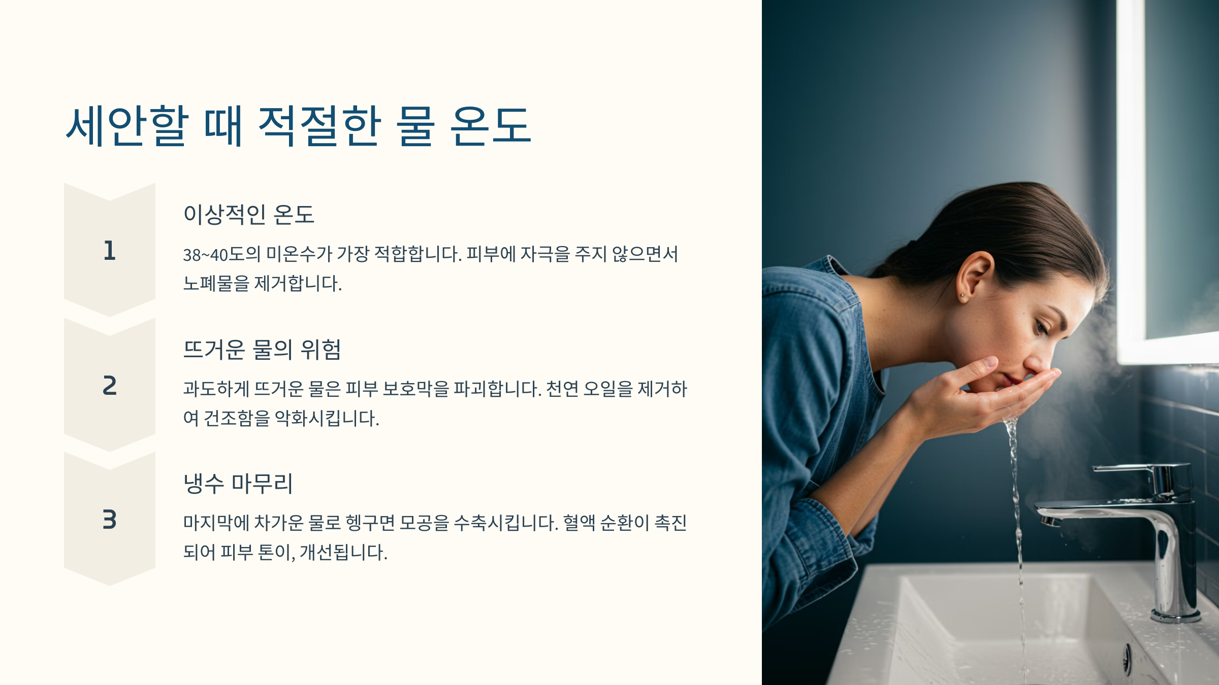 미지근한 물은 피부를 자극하지 않으면서도 피지와 노폐물을 효과적으로 제거할 수 있어요. 특히 건성 피부나 민감성 피부를 가진 분들은 뜨거운 물을 피하고 미지근한 물로 세안하는 것이 좋아요.